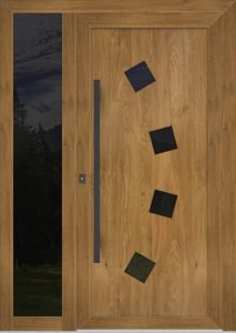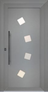 Panele drzwiowe o nowoczesnych kształtach, ich gładki design i wykonanie dodatkowo uzupełniają eleganckie aplikacje ze stali nierdzewnej.